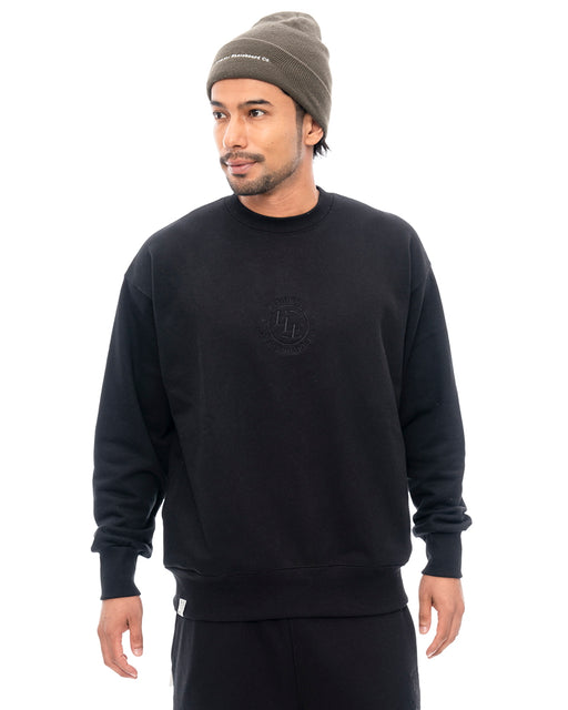 フロントセンターにボディカラーと同色のサークルロゴを刺繍したクルーネックトレーナー。背面にも同デザインを大判プリントで施しました。身幅に程よくゆとりがあり、肩を落としたオーバーサイズのシルエットで仕上げました。