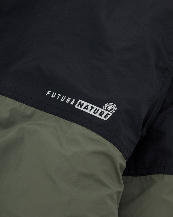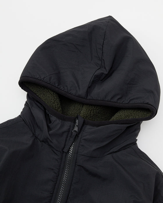 表面に軽量ナイロン素材、裏面にフリース素材を使用したリバーシブルボアジャケット。首周りまでしっかり保温する背の高い襟を採用。表面は左胸にツリーロゴを刺繍し、背面に“FUTURE NATURE”のメッセージをプリント。裏面のフリースは、左胸にシリコン製のELEMENTタグをさあしらいました。1枚で2パターン楽しめる汎用性の高いアイテムです。