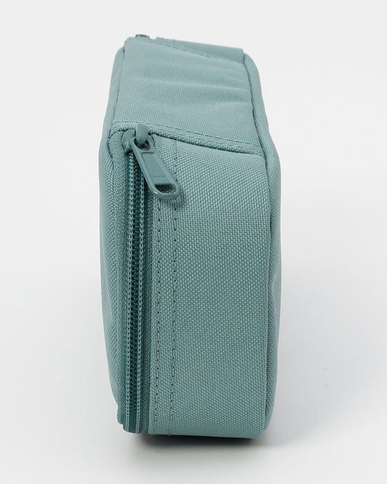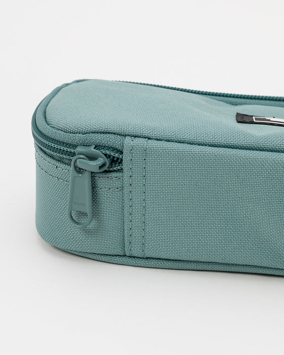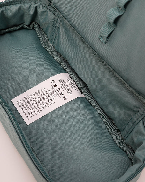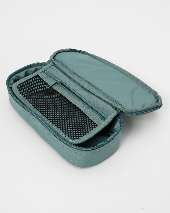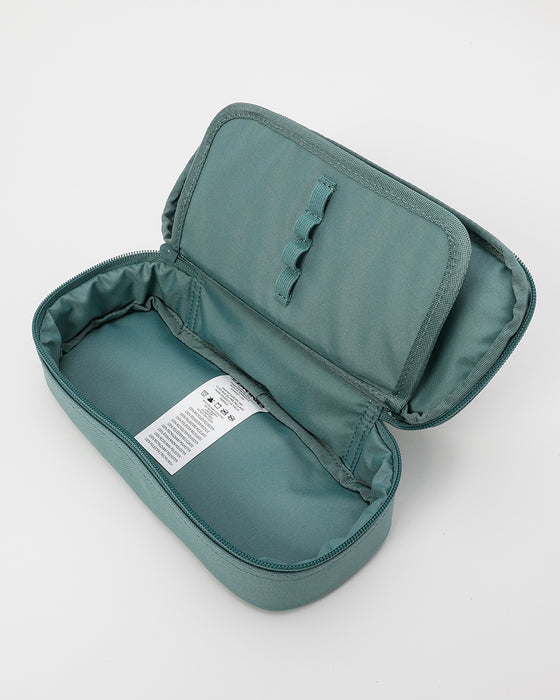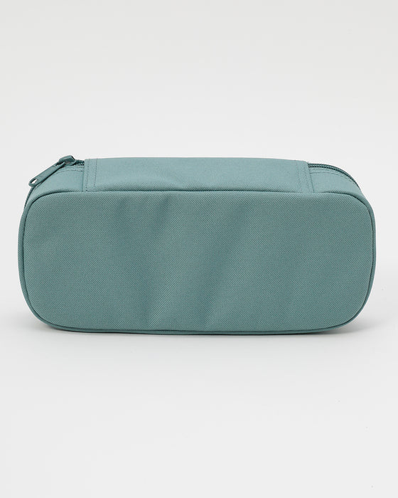 定規やハサミなどの文房具と筆記用具を分けて収納できるペンケース。内側に、メッシュポケット付きのペンホルダーを設け、中身を整理しやすくデザインされています。リサイクル素材を使用し、地球環境に配慮したサステナブルなアイテムです。フロントにDAKINEタグをデザインしました。