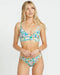 ボタニカル調の総柄ビキニ。アンダーが太めで安定感があります。胸元のデザインが特徴的で、デコルテを綺麗に見せるカッティングです。スタイルに合わせてお好みのパットを入れることができます。肩紐はアジャスターで長さ調節が可能。上下ともに、UVプロテクションを備えたストレッチ素材を使用しています。
