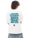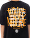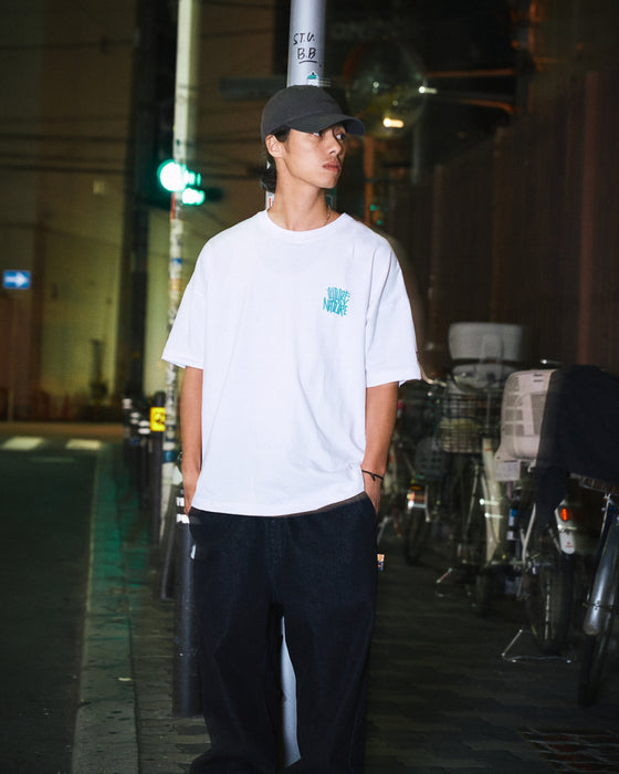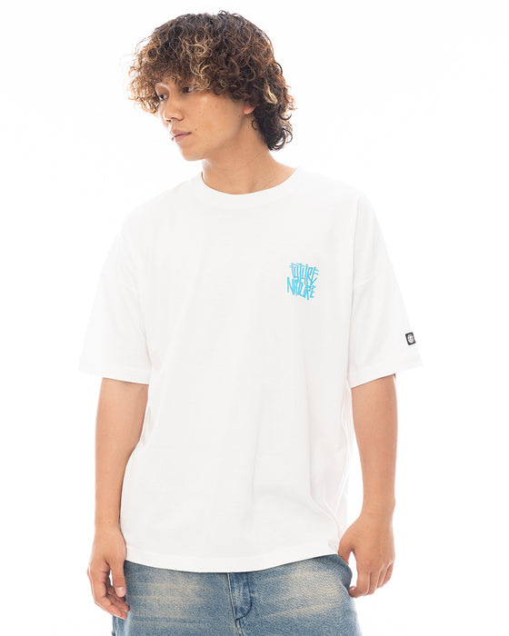 オープンエンド糸を使用した、コットン100%の天竺素材のTシャツ。左胸のワンポイントとバックにTAGGINGロゴをあしらい、バックにはメッセージのグラフを載せたデザインに。目を引く配色が特徴的な、ストリートライクな一着。左袖にはツリーロゴのパッチ。