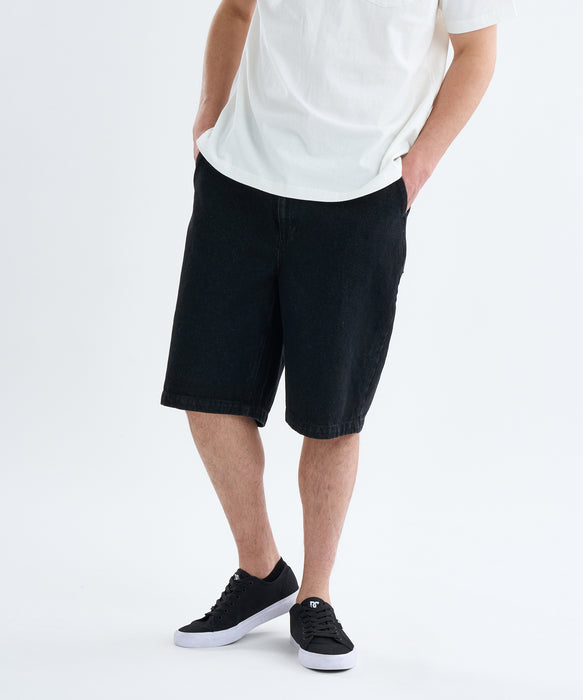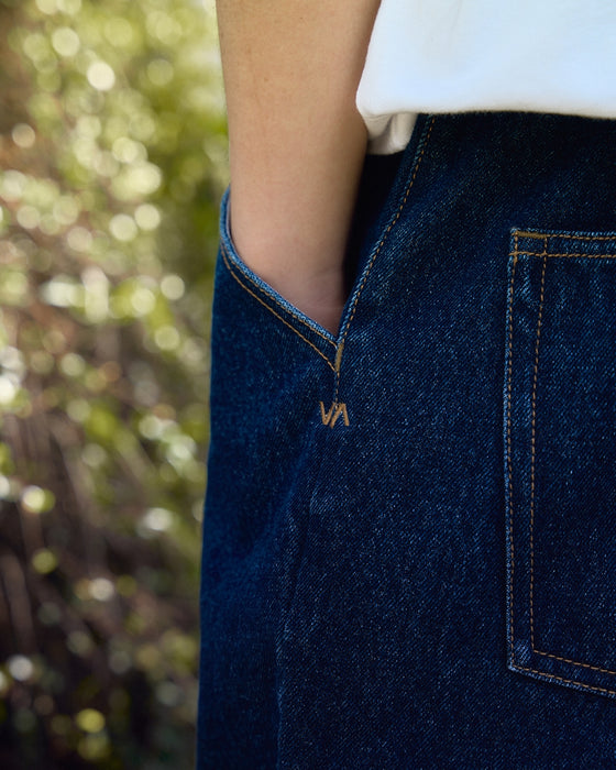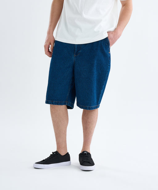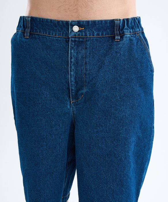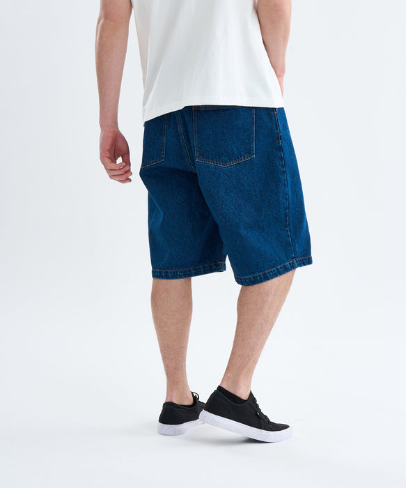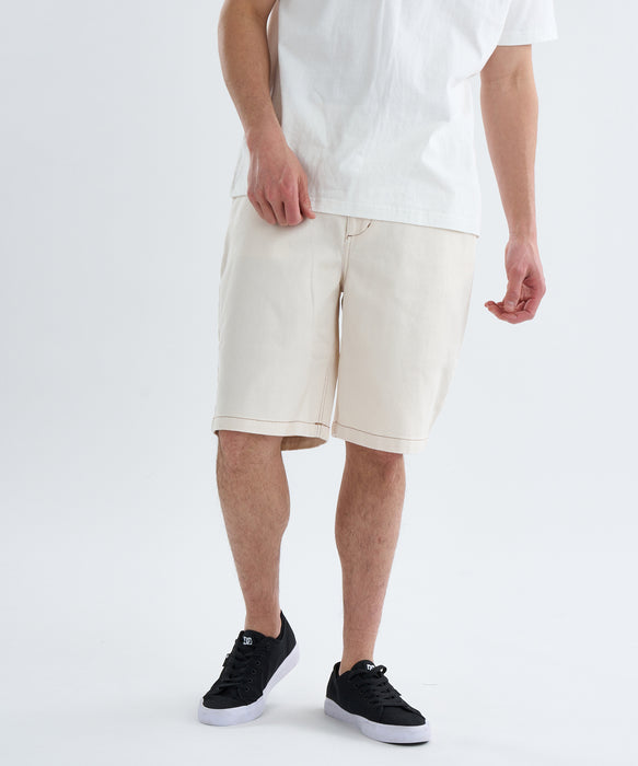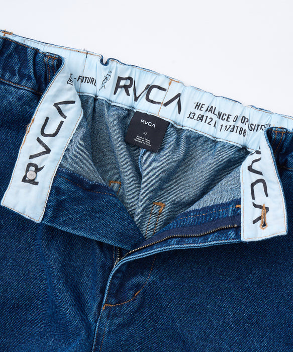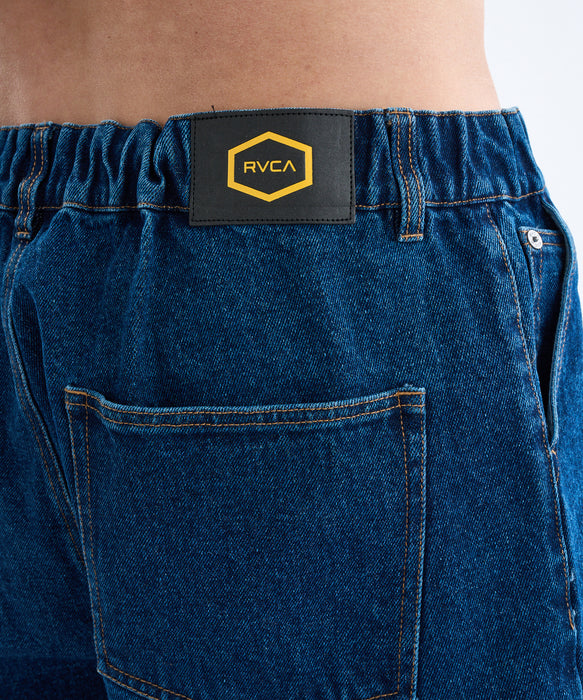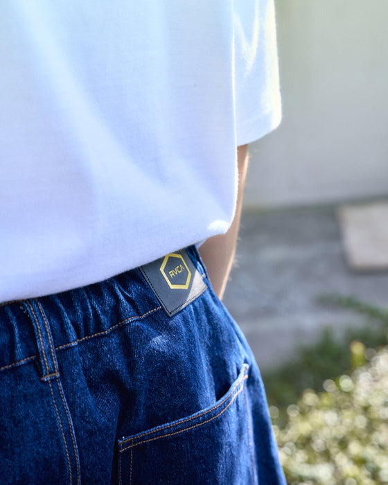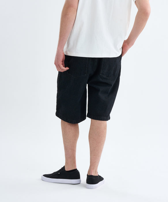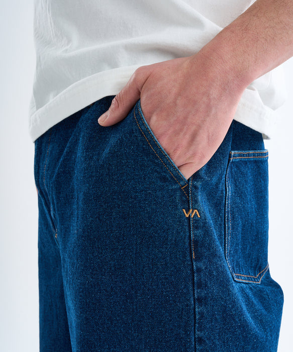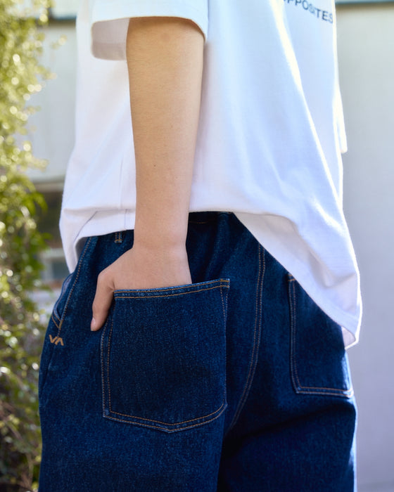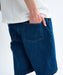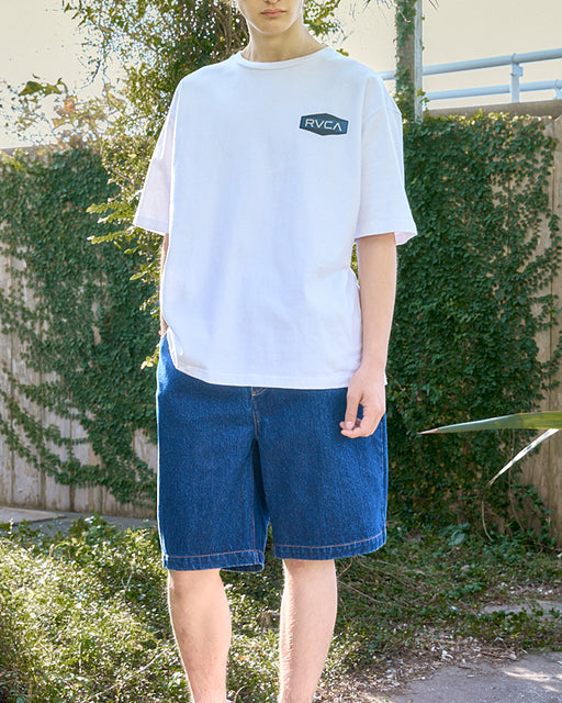 存在感のあるワイドシルエットのデニムショートパンツ。程よくルーズで、スニーカーとの組み合わせも抜群です。ウエストはイージーパンツ仕様に変更し、より快適な履き心地へとアップデート。左ポケット部分にワンポイントでVAロゴがステッチで施されています。