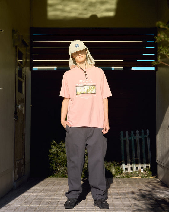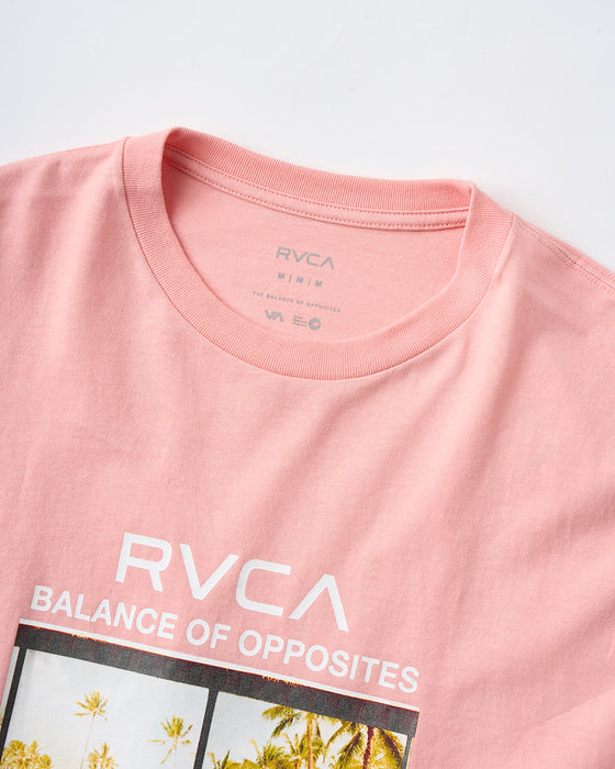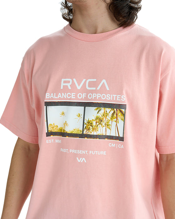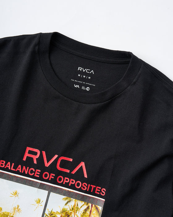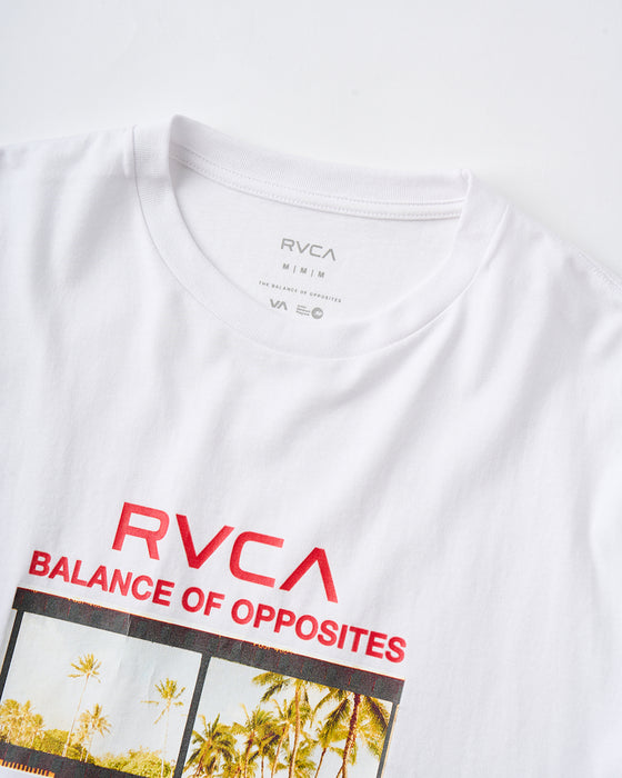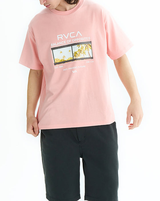 風合いの良い100%コットンを使用したクルーネックTシャツ。フロントセンターにはフィルム調のグラフィックと、RVCAロゴ、“THE BALANCE OF OPPOSITES”のメッセージを施したトレンド感ある1枚です。タイト過ぎず、ワイド過ぎないほどよいシルエットです。