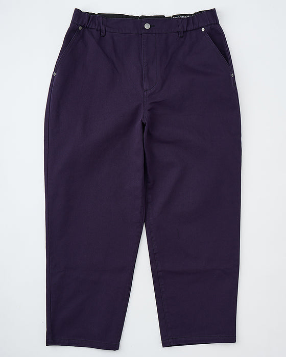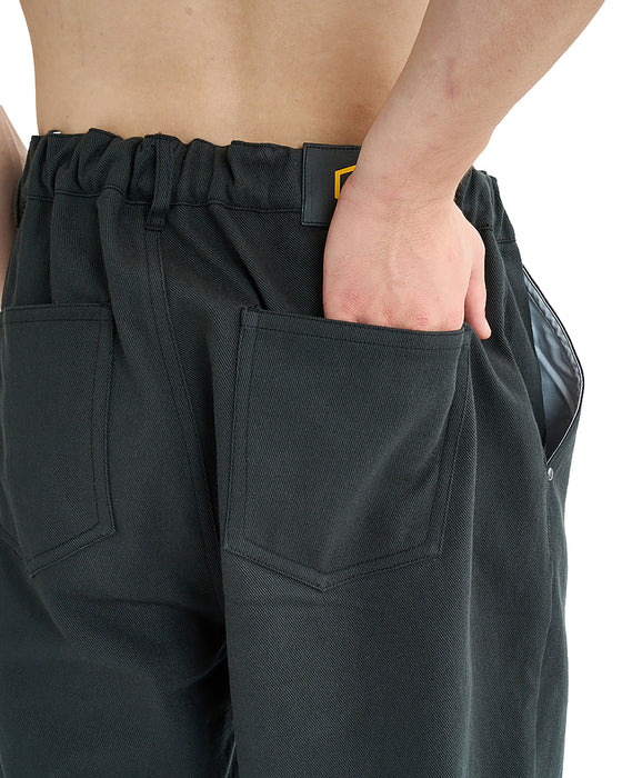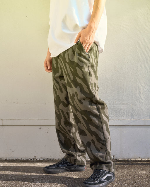 存在感のあるワイドシルエットのデニムパンツ。程よくルーズで、スニーカーとの組み合わせも抜群です。ウエストはイージーパンツ仕様に変更し、より快適な履き心地へとアップデート。左ポケット部分にワンポイントでVAロゴがステッチで施されています。無地とカモフラ柄での展開です。