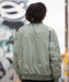 ヴィンテージ加工を施したナイロンツイル生地に、薄手の中綿を入れたフライトジャケット。左胸の刺繍と共地アップリをあしらったバックスタイルがインパクト抜群。フラップ付きサイドポケットや袖のジッパーポケット、立体的なパッカリングなどディテールにもこだわった。