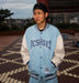レトロカジュアルな印象を与えるスタジアムジャケット。胸元にはスポーティなロゴアップリケをあしらいました。ポリエステル素材のサテン生地を使用したブラック、ライトウォッシュ加工を施した2カラーのストレッチデニムをラインナップ。首元や裾の編み立てリブ、袖のワッペン、フロントのウーヴンラベルなどディテールにもこだわっています。