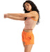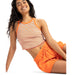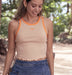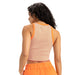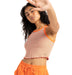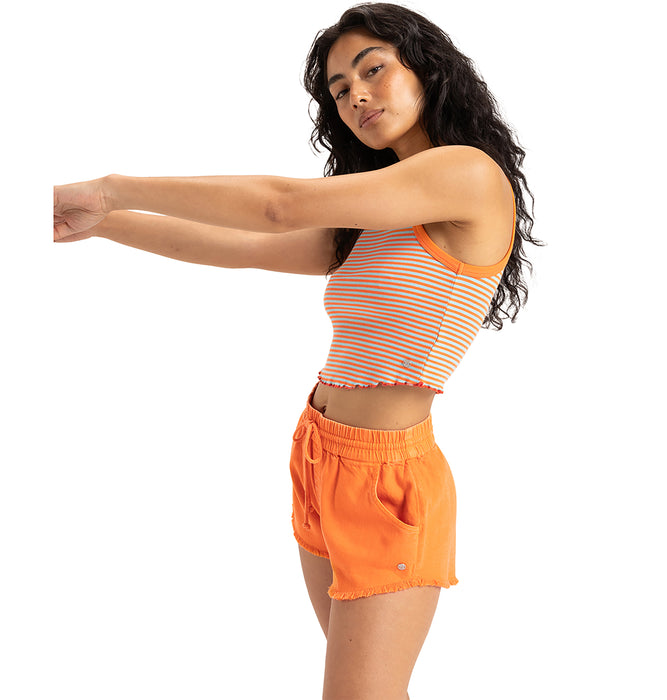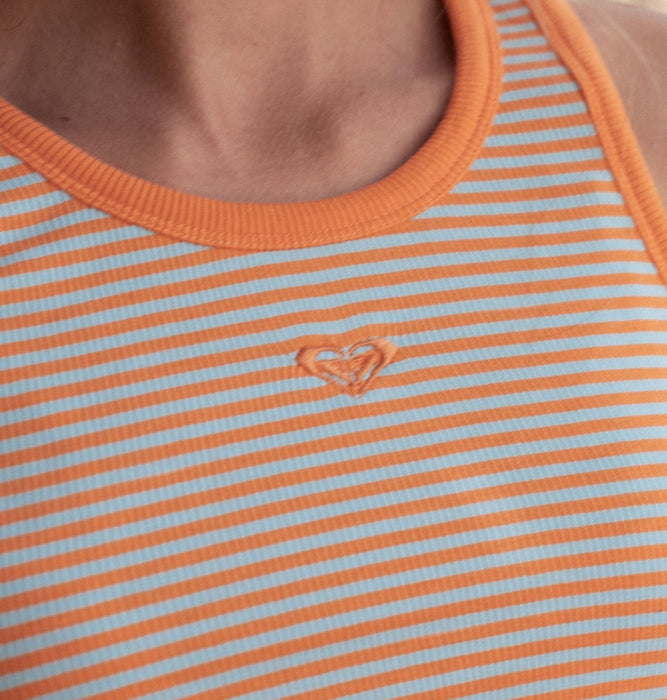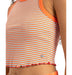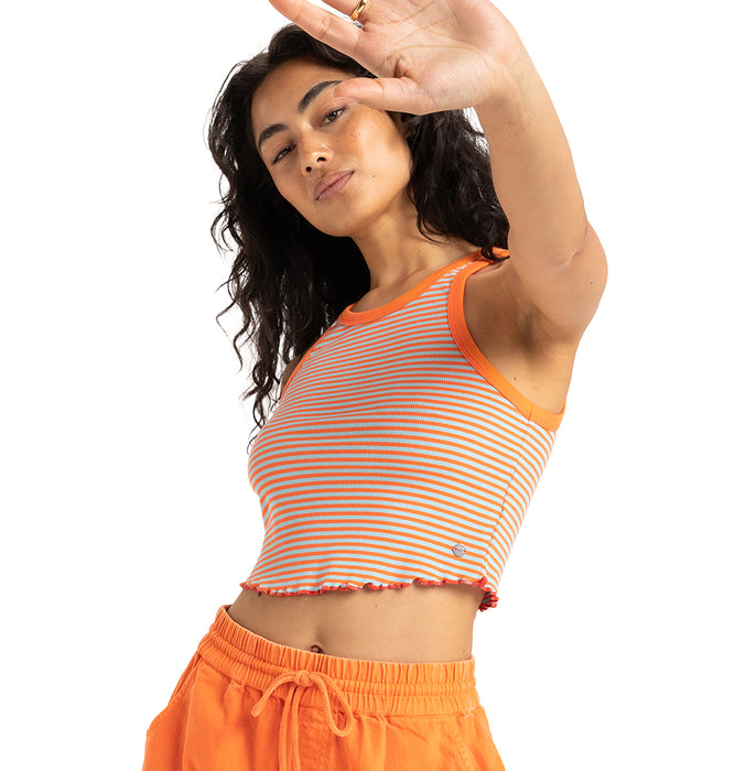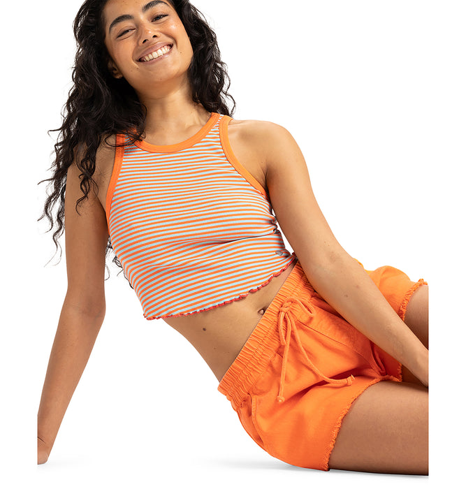 ノスタルジックなミントグリーンとオレンジの配色がおしゃれなマリンストライプのクロップド丈ノースリーブトップス。伸縮性の高いベビーリブ生地で、ぴったりとしたシルエットで着こなせます。裾はフリルのように揺れ感のあるメロー始末。袖口と襟もとはパイピングで仕上げました。コンパクトなトップスなので、スタイルアップ見えするデザインです。