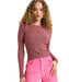表地はパイルのテクスチャーのロングスリーブトップス。コットン混で着心地抜群です。ボーダーの総柄で胸元にROXYハートの刺繍を配色であしらいました。薄手なので、重ね着のインナーとしても、一枚でも着られるので、秋から冬まで着回しできるアイテムです。