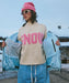 ミドルゲージのクルーネックセーター。ドロップショルダーで少しゆったりとしたシルエットです。襟、裾、袖口はリブの仕様。トレンドのピンクの糸で編み込んだ「SURF」「SNOW」のメッセージがROXYらしい一枚です。