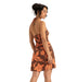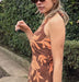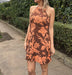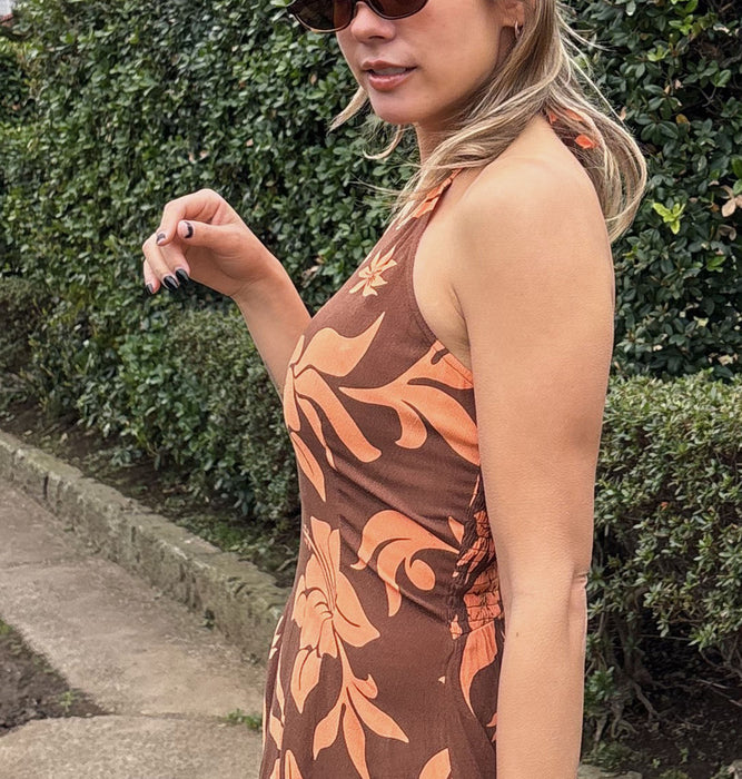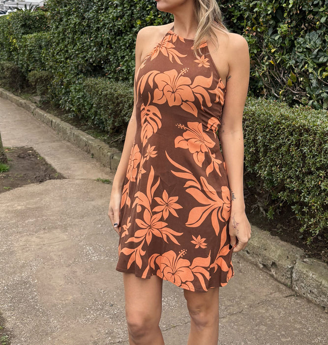 ちりめん加工のレーヨン生地を使用した、ホルターネックのミニ丈ドレス。ハイビスカスを今シーズンのキーカラー、パーシモン✕ブラウンで仕上げた大人っぽい雰囲気が魅力です。バックはシャーリングの仕様で、着心地も抜群。スカートはフレアのシルエットで、高く設定したウエストラインの効果でスタイルアップして見えるのもポイントです。