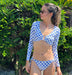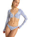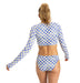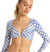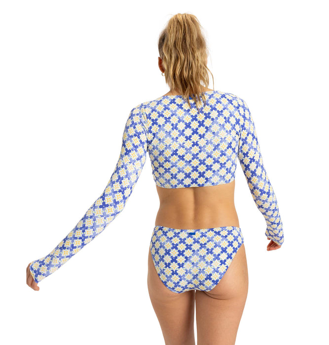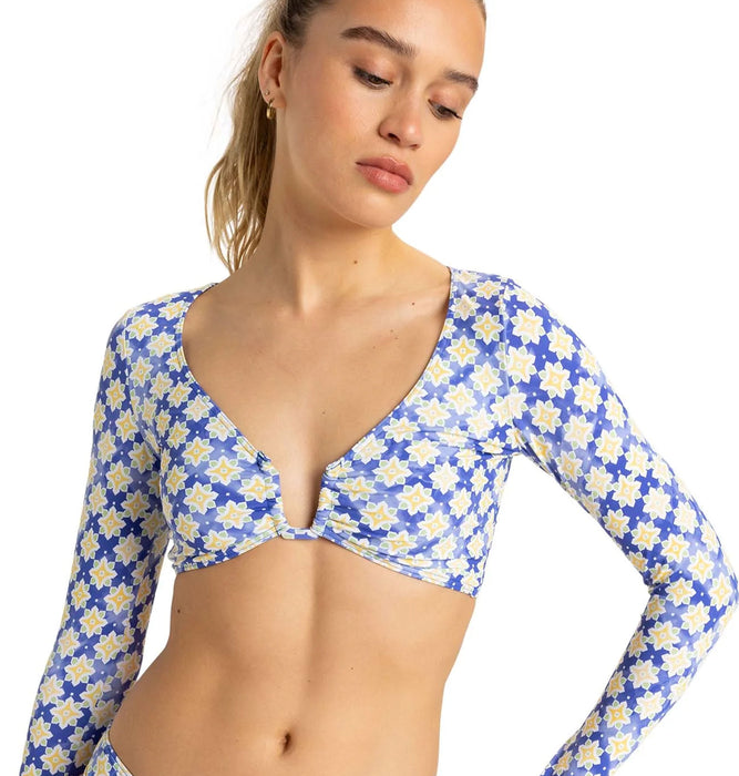 ブルーベースのタイル柄が印象的なクロップド丈のラッシュガード(トップス)。水着の上から羽織っても、もたつくことなく、水着のように着用できるアイテムです。腕が直射日光に当たるのは避けたいけれど、おしゃれも楽しみたい方にピッタリのアイテムです。胸元にU字ワイヤーをあしらっているのがポイントで、かぶりの仕様。パッドはついていないので、下に水着をレイヤードしたり、ニップレスを使って着用するアイテムになります。