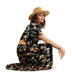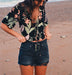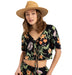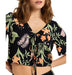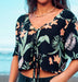 ブラックベースにボタニカル柄をあしらった、布帛素材のショートスリーブトップス。Vネックのデザインがデコルテを綺麗に見せてくれます。フロントにはリボンのレースアップ風の飾りをあしらいました。縫い留めしてあるのではだける心配がありません。同柄のスカートと合わせて、ワンピース風な着こなしも楽しめます。