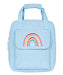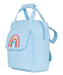 コーデュロイ素材のリュック。メインコンパートメントはざっくりとお菓子やおもちゃなどを収納できるサイズ感。開口部はファスナーの仕様です。フロントには面ファスナー付きのフラップポケットを取り付けました。レインボーとROXYハートをあしらってアクセントにしています。持ち手付きなので、トートのように持ち歩くこともできます。