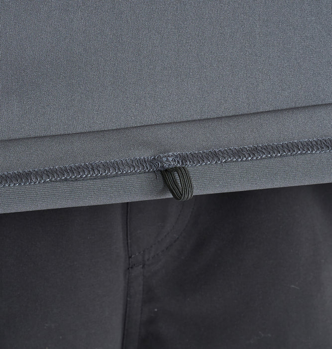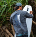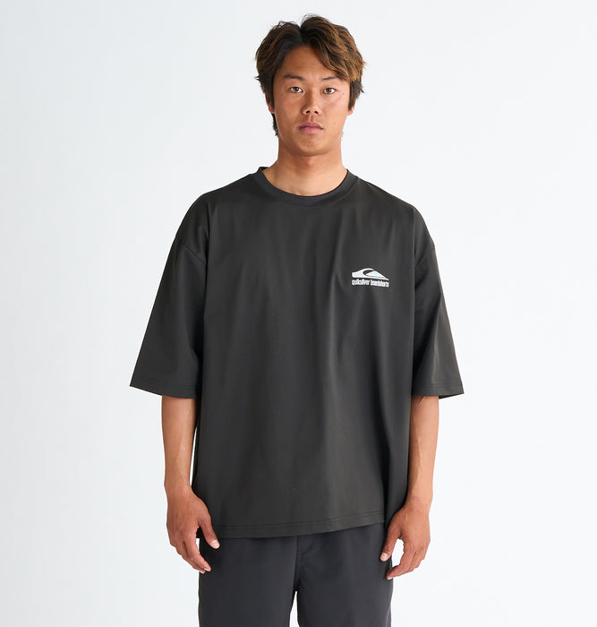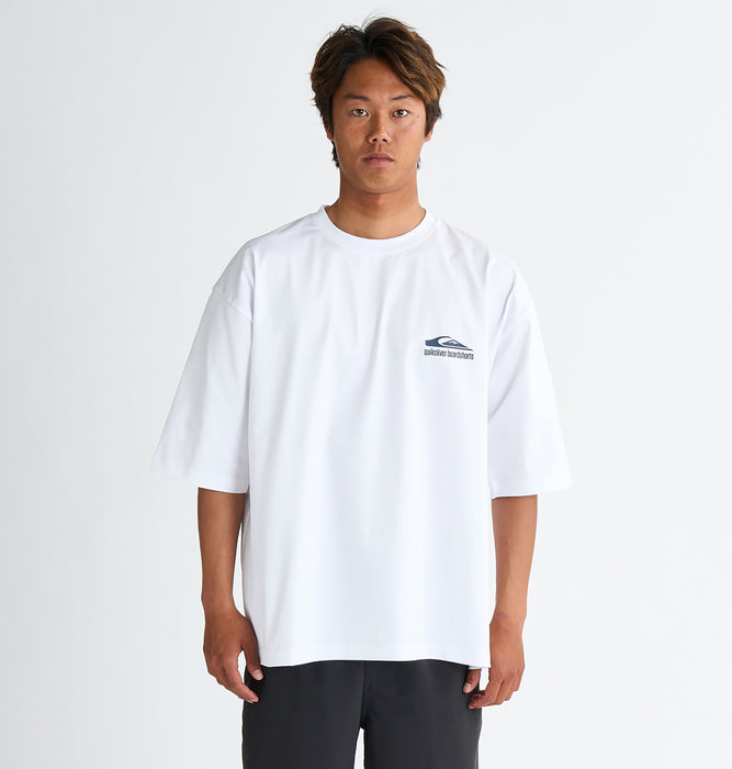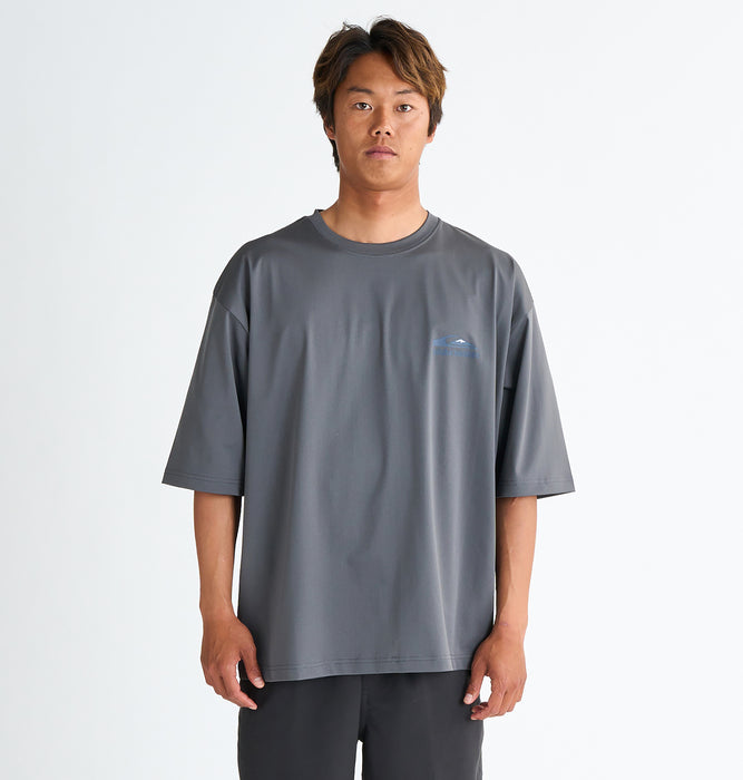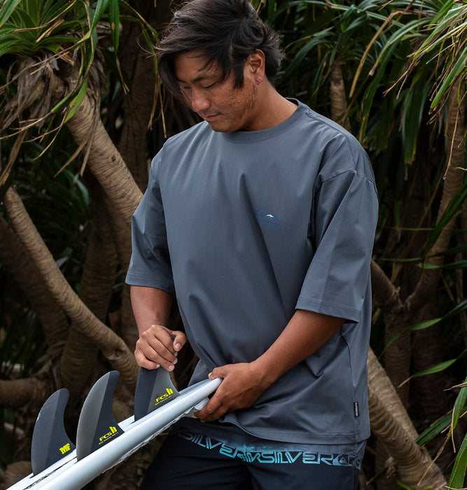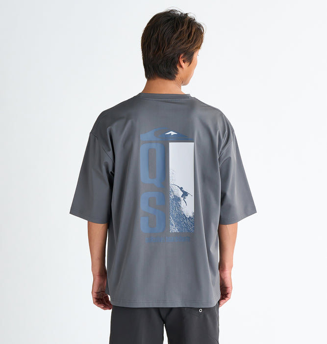 グライドウェーブ生地を使用した半袖ラッシュガード/ユーティリティTシャツ。ポリエステルの捲縮糸によって、高いストレッチ性を保ちながら劣化に強くハリがあるのが特徴。左胸にはQUIKSILVERロゴ、背中にはフォトプリントとQUIKSILVERロゴをミックスさせたグラフィックをプリントしました。シルエットは程良くゆとりのあるルーズフィット。