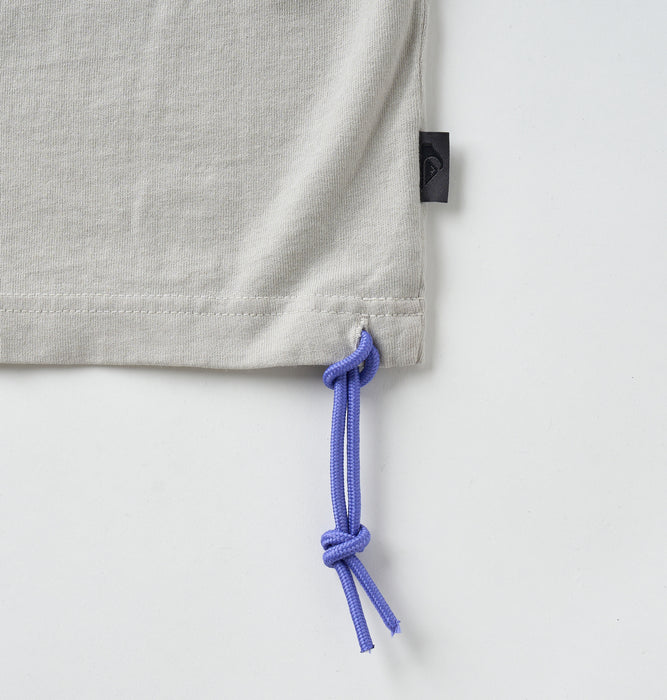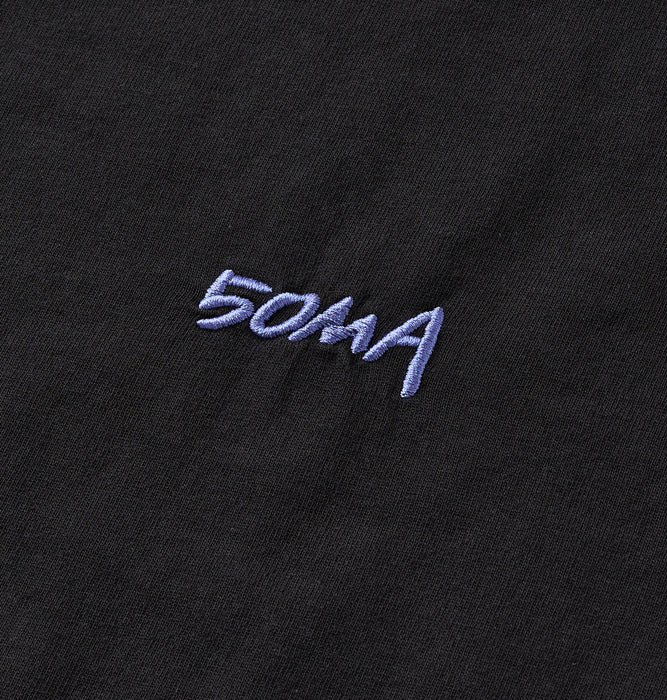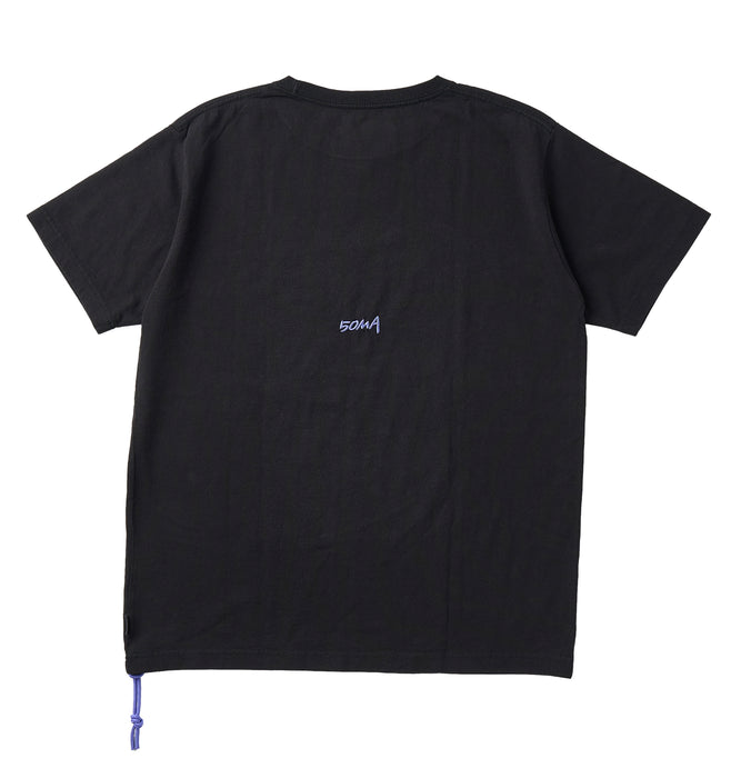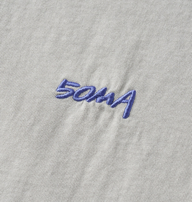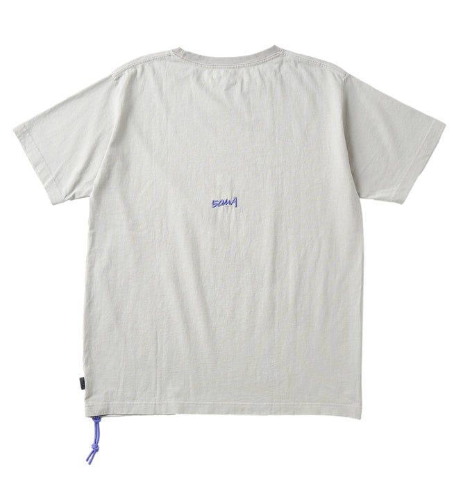 コンセプトは「STREET,STREET,STREET」世界中を旅する五十嵐カノア。都会の特に東京のストリートカルチャーに、自身が感銘したMOMAの喚起するクリエイト・マインド・インスピレーションをMIXさせたコレクション「50MA」。着心地の良い膨らみを持つ空紡糸を使用したUSコットン天竺素材の半袖Tシャツ。異なる染料同士を絶妙なバランスで掛け合わせたものにボールバイオウォッシュ加工を施す事で独特なUSED感を表現。フロントにメッセージとSNOW CAP無しの山波ロゴをプリント。背中に小さく50MAロゴを刺繍。シルエットは汎用性の高いレギュラーフィット。左裾には取り外し可能なリーシュロック付き。