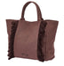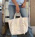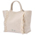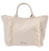 厚手のキャンバス素材を使ったトートバッグ。普段使いできるサイズ感で、マチ付きの底は硬めで安定感があるのが特徴。縦に2本フリンジテープをつけました。刺繍で施したROXYロゴがアクセント。開口部はドットボタン、内ポケット付き。