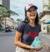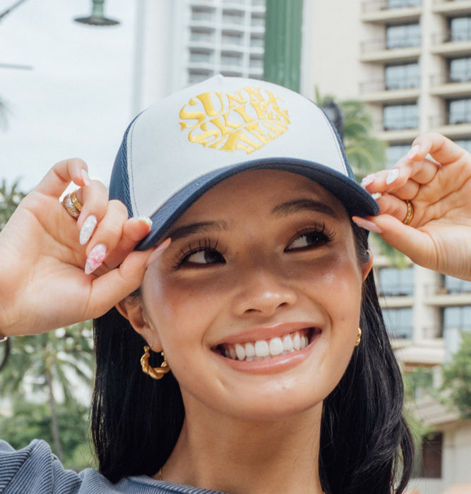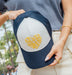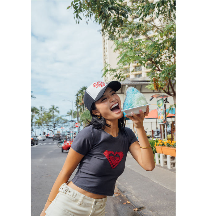 フロントにハート型のメッセージグラフィックを刺繍した、5パネルのメッシュキャップ。スナップバックの仕様で、アジャスターの横にはピスネームを取り付けました。3色展開です。