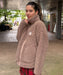撥水加工を施した生地が特徴のボアジャケット。中綿を入れ、裏地はキルトステッチで仕上げました。胸元にはオリジナルのフラワーのワッペンをあしらい、身幅と丈感がゆったりしていて、襟にボリュームがあるので、外側に折り返してアレンジするのもおすすめです!裾はラウンドのフォルムでアジャスター付きのゴムを搭載しているので、シルエットの変化を楽しめる一枚です。
