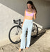 ふくれ織りのリブ素材が特徴的なフレアパンツ。UVカット加工と速乾機能を搭載しました。ウエスト下にはスクエア型のロゴワッペンをあしらいました。ビーチやプールなどのレジャーシーンに、一着は持っておきたいアイテムです。デイリーに着るのもおすすめです。