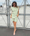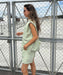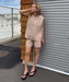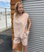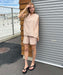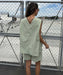 前後2WAYで着用できるノースリーブトップスと、ハイウエストのキュロットのセットアップ。トップスの肩部分はタックのデザインになっているので、二の腕をスッキリと見せてくれます。また、裾にはスリットを入れました。ショーツのウエストはフロントはフラット、バックはゴム仕様。裾にはデザインのポイントとしてドローコードをあしらいました。くすみ系カラーでおしゃれな雰囲気をキープしつつ、水辺でも着用できるトレンド感あるアイテムです。