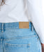裾に向かってカーブしているシルエットが特徴の、ハイウエストワイドデニムパンツ。ダメージ加工を部分的にあしらい、しっかりウォッシュ加工を施したCBNと、色落ちしたBLKの2色展開です。ウエストの内側左前にメッセージの刺繍をあしらい、ウエストバックにはレザー調のパッチを施し、オリジナルのロゴ入りタックボタンとリベットもポイントです。