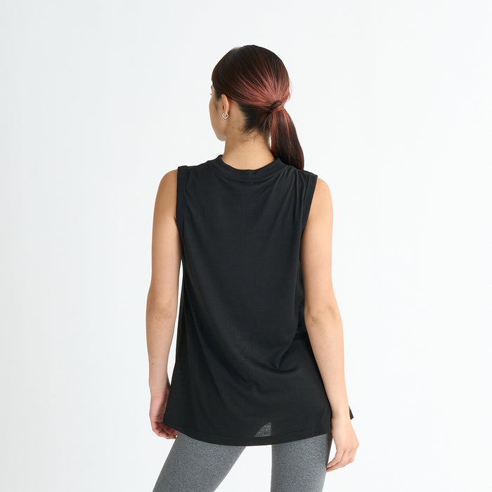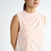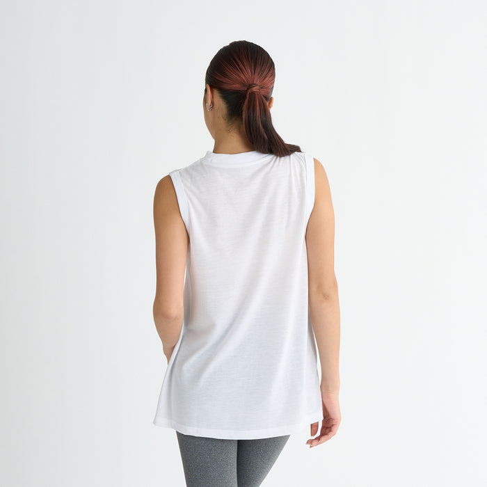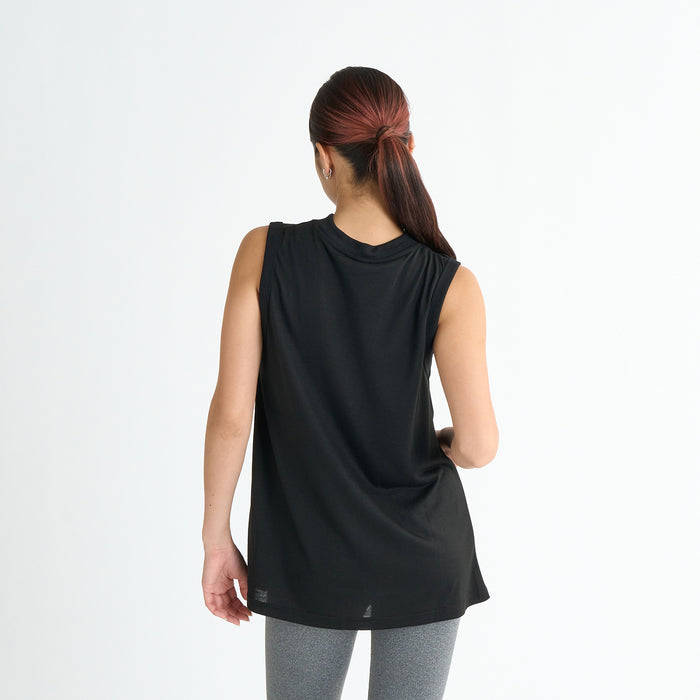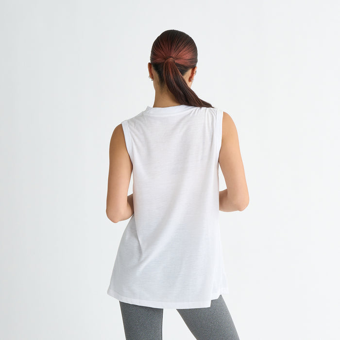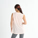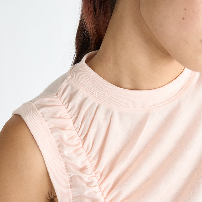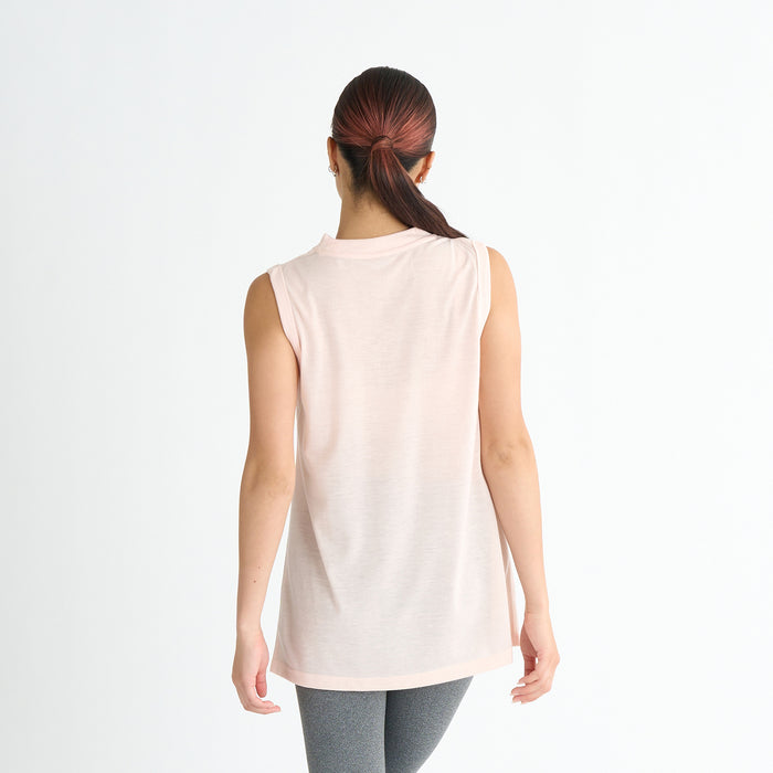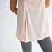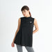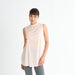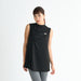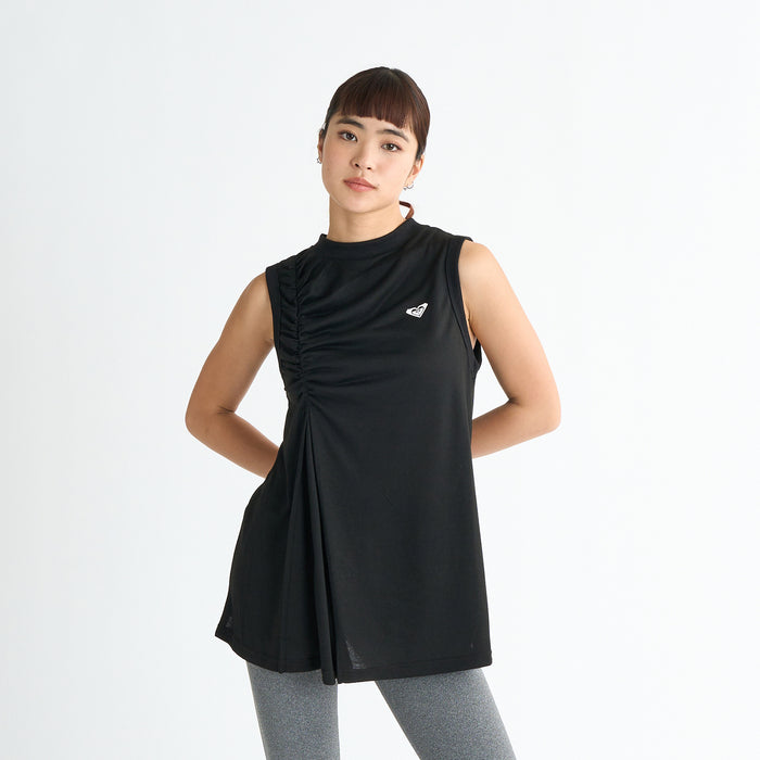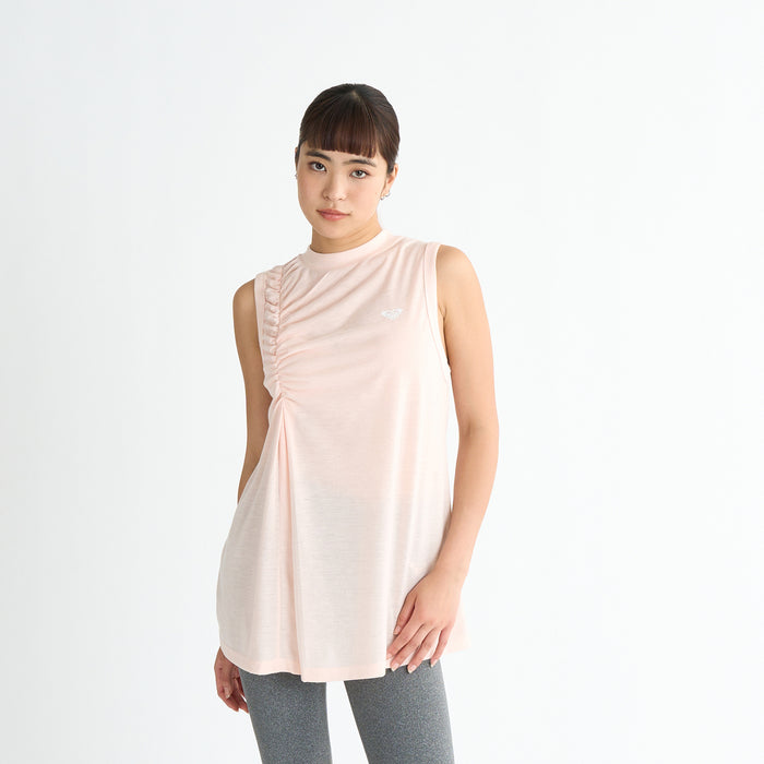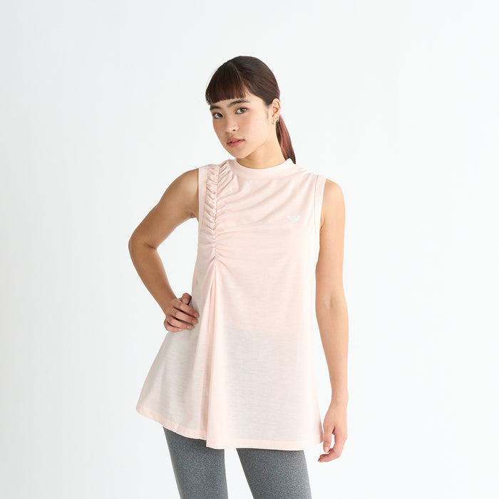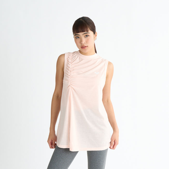 表面感のあるスラブ調ポリエステル素材のチュニック丈タンクトップ。フロントサイドにギャザーとスリット風のデザインを施し、アシンメトリーに仕上げました。着丈が長めなのでヒップラインを気にせず、レギンスなどのタイトなボトムと合わせたコーディネートが楽しめます。速乾性のある素材です。