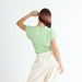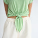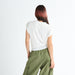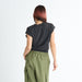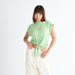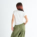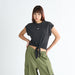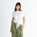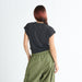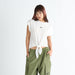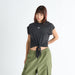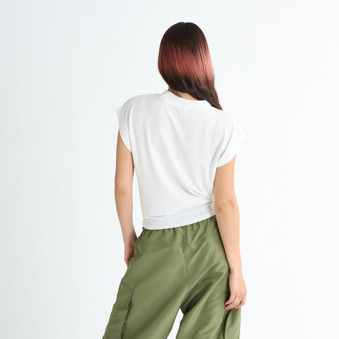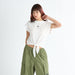 リネンライクなポリエステル素材のプルオーバートップス。伸び感と透け感があり、柔らかい風合いが特徴の生地で、古着風のニュアンスを演出します。ドロップショルダーでアームホールを大きく仕上げました。裾のリボンは自由に調整できるので、好きなシルエットで着用することができます。