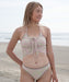 シェルステッチをあしらってクラフト感をプラスした三角ブラと、小さめショーツ、マルチウェイスカートの3点セット。スカートにはドローコードがついているので、着丈の調節ができたり、ベアトップ、ホルターネックにもなる4WAY仕様。シーズナルのプリントを含む豊富なカラー展開なのでお気に入りの1枚が見つかります。