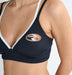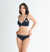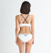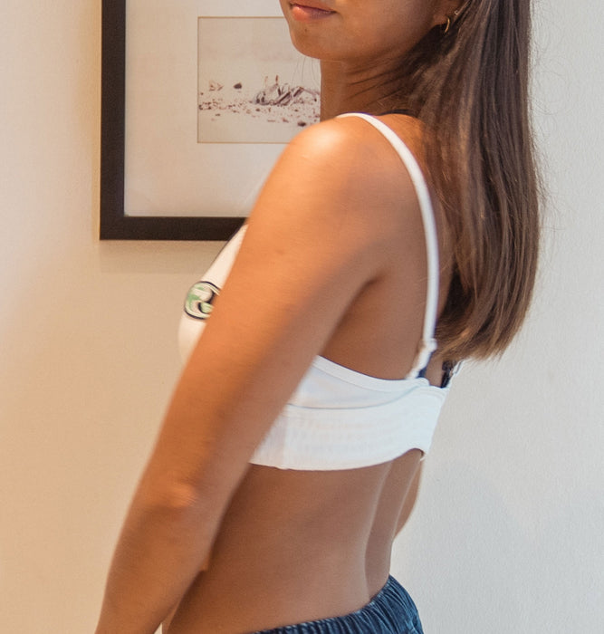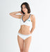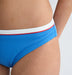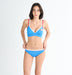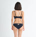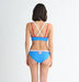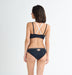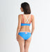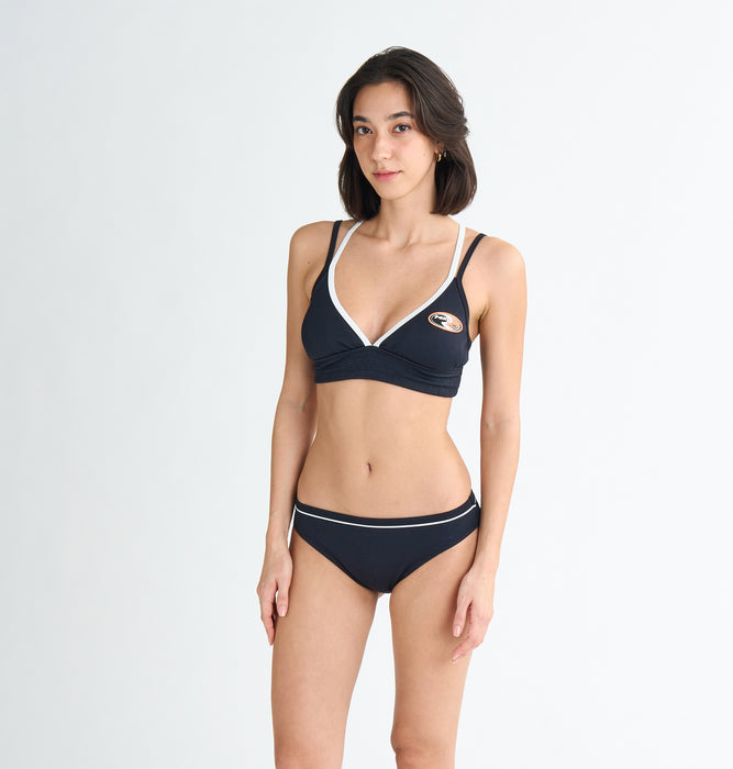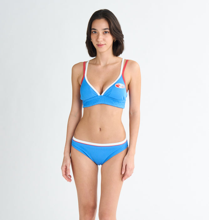 細めのリブ素材で、ヘリテージロゴをキーモチーフにした、レトロ感のあるスポーティなサーフスタイルのスイムウエア。ブラトップはアンダーがシャーリング仕様になった三角ブラタイプで、ワッペンのカラーとマッチさせたダブルストラップが特徴です。パッドは取り外し可能、ショルダーも調整できます。ローウエストでトレンド感のあるシルエットのショーツは、ベルト部分に配色パイピングでアクセントをプラスしました。